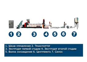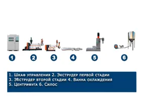 ⚡ В нашем каталоге вы найдете различные по комплектации линии грануляции, способные обеспечить производительность на уровне от 300 до 450 кг в час. Готовая продукция после досушки может быть упакована в биг-бэги для дальнейшего хранения или сразу отправляться на производство в литьевые машины или оборудование для производства пленки.