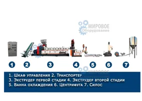 Компания «Мировое оборудование» предлагает различные по комплектации линии грануляции с водокольцевой резкой. Увеличить эффективность линии можно с помощью компактора. Последний обеспечивает более качественное спаивание и гомогенизацию частиц основного материала с добавками в виде красителей, антиоксидантов, стабилизаторов, пластификаторов и т.д. При этом наблюдается значительная экономия ресурсов в частности электроэнергии. При использовании компактора уровень электричество может сократиться на 40%.